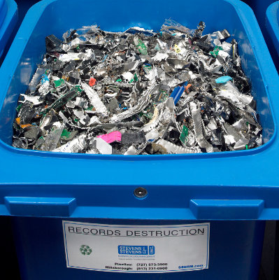 Stevens & Stevens’ Data Destruction Service follows these guidelines and can shred your hard drives, storage tapes, DVDs, CDs, zip drives and all other e-waste. Our method leaves behind an unreadable pile of debris. Plus, it eliminates the potential hazard of do-it-yourself methods. We’ll also provide you with a Certificate of Destruction which serves as proof of your compliance and corporate due diligence. If you’d like to learn more about our media destruction services, click here.